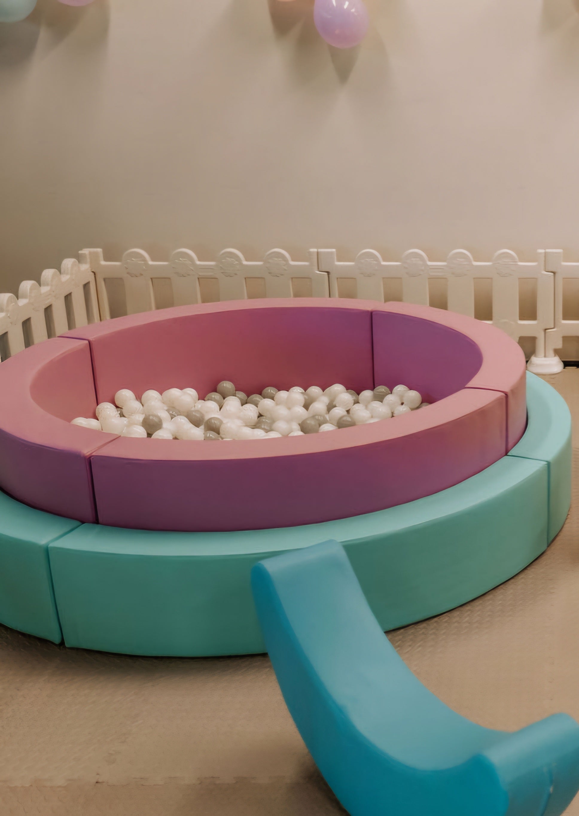- Square ball pit with stairs - white & rose gold balls or Pink/Blue ball pit - white & grey balls
